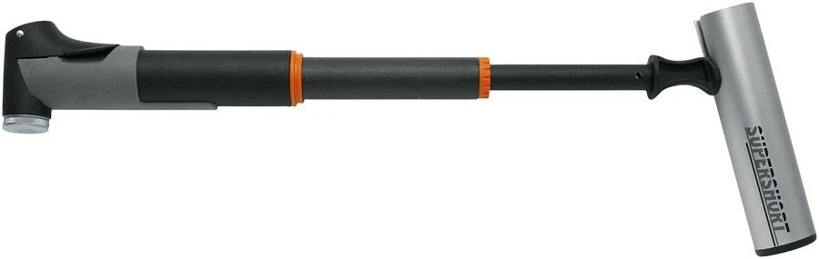 The very light, compact and high quality SKS Supershort pump with telescopic function and T-Grip is only 16cm long. The detachable aluminum body transforms itself at lightning speed into an ergonomic T-Grip. Due to the clamp lever, the reversible valve head can easily be connected to all valve variations. 6 bar/87psi max.