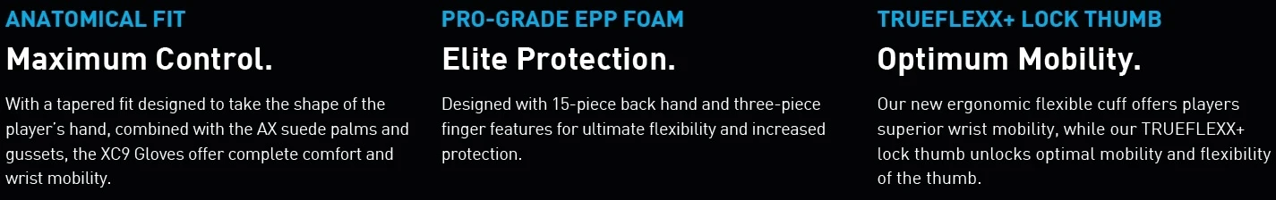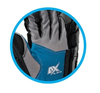 EXTERIOR SHELL FEATURING PREMIUM NYLON AND TEXTURED PU.ย AX SUEDE BASE PALM SEWN IN WITH TRUE BLUE AX SUEDE OVERLAY.ย PRO GRADE 24MM EPP FOAM WITH PE INSERTS.