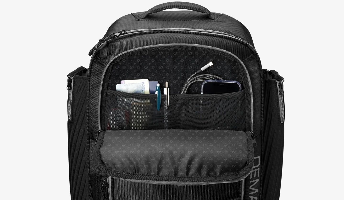 Built to carry your entire haul and then some. Introducing the DeMarini Spectre Backpack, the massive pack designed with an extra-large main compartment to stash several bats, multiple ball gloves and all the gear you need to stay sharp during weekend long tournaments. A reinforced interior shelf allows you to organize your most prized possessions, and the expandable neoprene bat sleeves hold up to four bats so you can keep your full arsenal close. A fleece-lined valuables pocket holds your phone and wallet within reach, and the padded shoulder straps keep you comfortable on your walk to and from the field. At game time, hang the Spectre backpack on the fence with the integrated hooks, then take out your tools and get to work.
