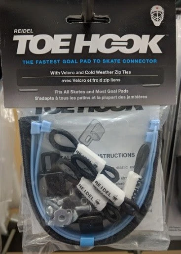 ToeHook fits nicely on most pads, using the holes vacated by those messy laces. The elastic extension can be secured to any make of goal or regular skate.