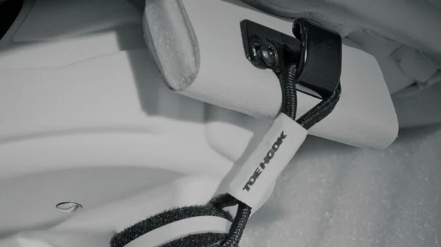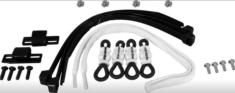 2 ToeHooks, 4 elastic extensions, assorted screws, ties and instructions. Extra elastic extensions are also available.