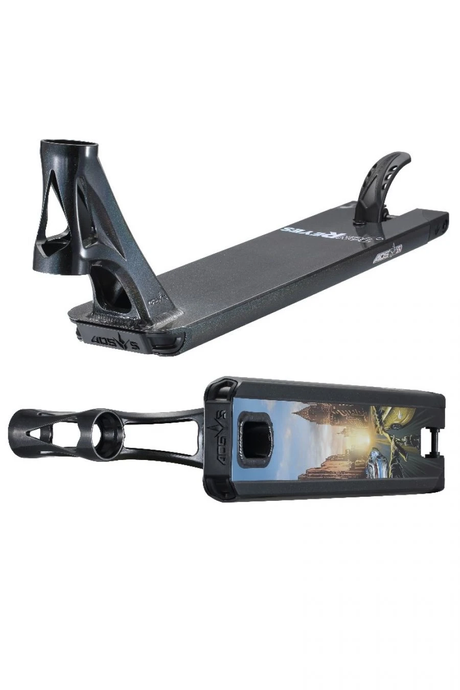 His deck is covered in a โNight Skyโ colourway Black with a speckle finish. The base of his deck has his custom โUniverseโ graphic that contains an homage to his late father just like his Reaper graphic. The silhouette of him staring off into the sky imagining all things great.