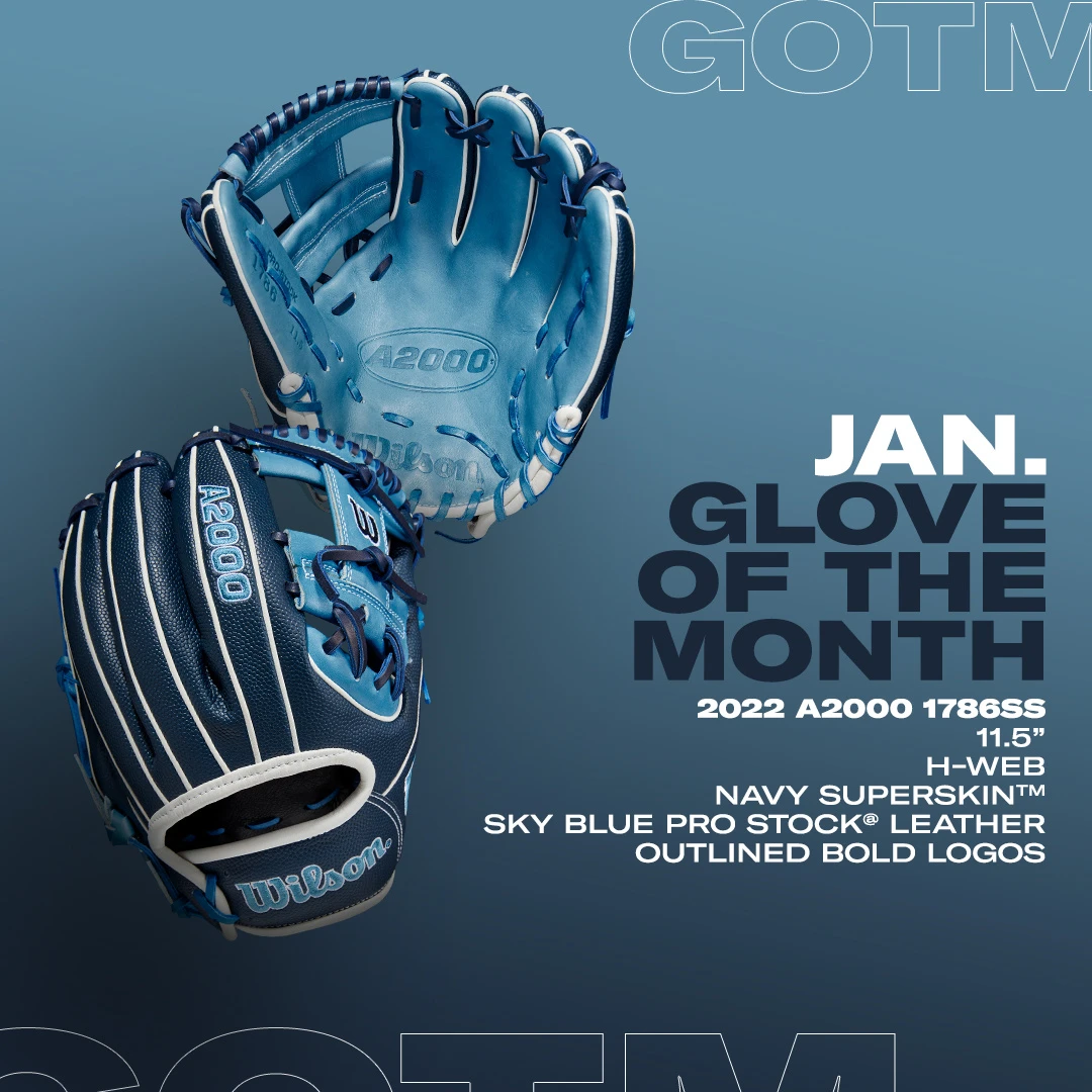 Frosty. Own the infield in 2022 with January’s GOTM, an A2000 1786SS with Navy SuperSkin, Sky Blue Pro Stock leather and icy Outlined Bold Logos.