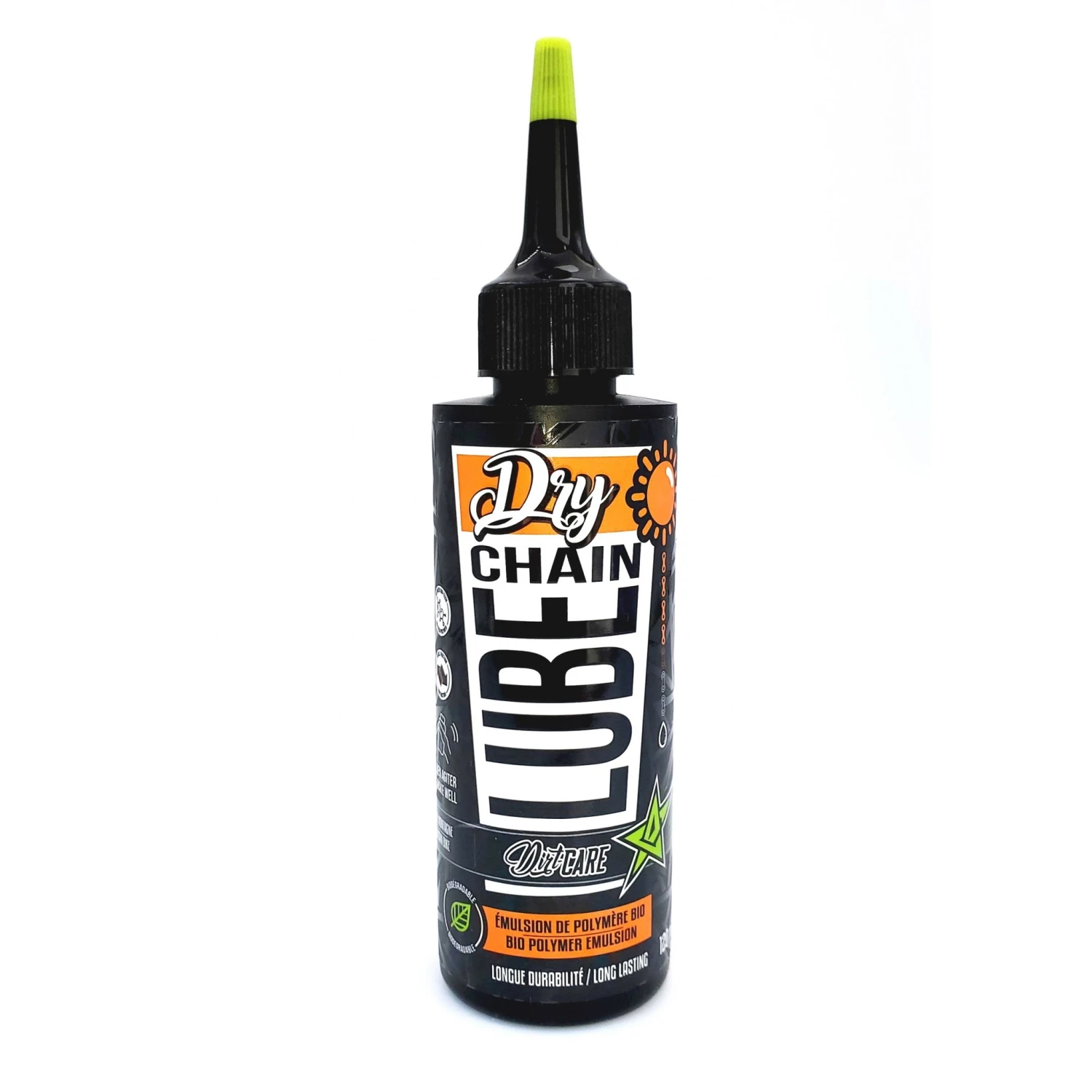Dirt-Careβs DRY Chain Lube will not build up inside chain links, derailleurs, cleats and shifters.