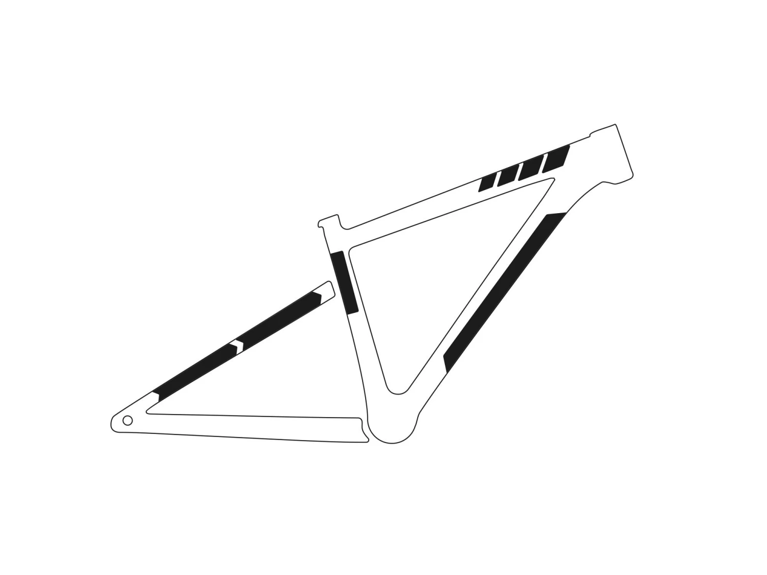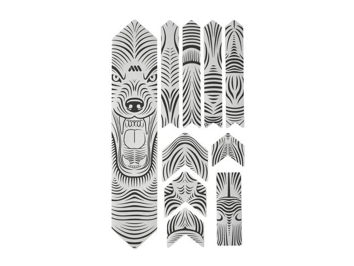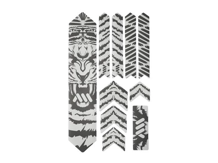 - 10 parts for a universal protection system: 1 big part for the down tube; 4 arrow parts for extending the down tube protection or top tube, 4 parts for the chainstay; 1 rectangle for cable wear protection or other uses.