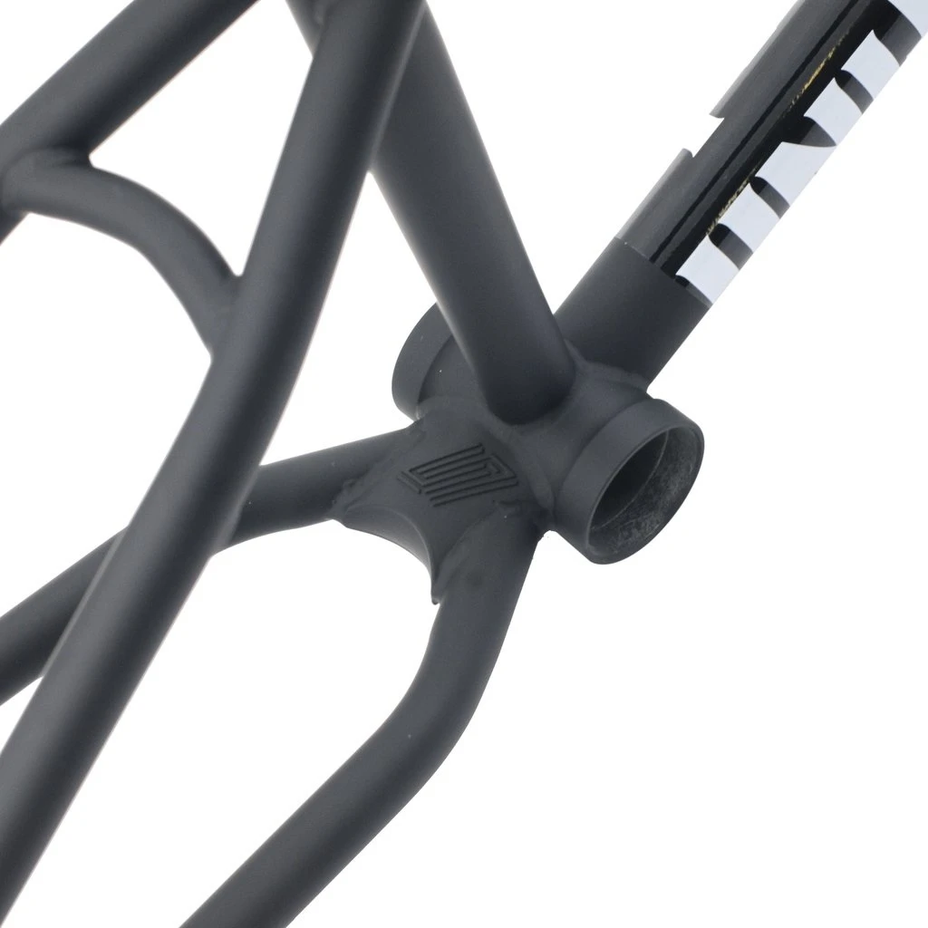 13” slammed back end with thickened chain stays. Top and Down tube gussets for extra strength out the front. Relatively steep head tube angle at 75.5 to keep front-end tricks responsive. We even added removable brake mounts due to popular demand!