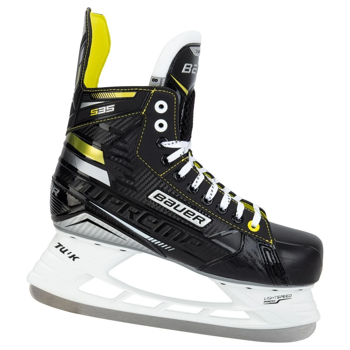 The Supreme S35 skate is for the rec hockey player. A 3D POLY CARB QUARTER offers added flex, step-in comfort, and visual richness. A 30 ounce Tongue with mesh metatarsal guard provides additional comfort and the βSβ STAINLESS STEEL blade offers great value and durability. Itβs being offered in traditional lengths and D Width only. Its FLEX RATING comes in at 55, a more forgiving boot for the recreational skater.