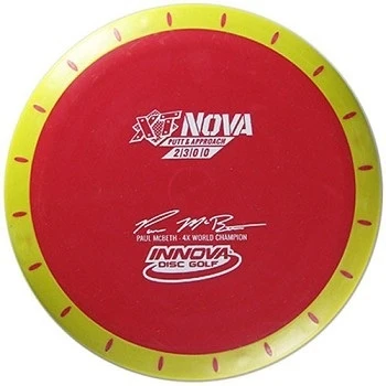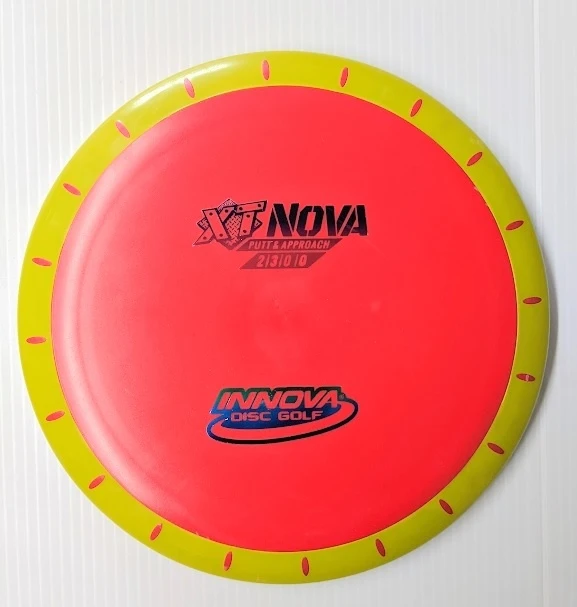 The Nova is a unique putter designed with overmold technology. The flight plate is made from a firm Pro material that’s fused to a grippy putter Pro plastic rim. The soft rim absorbs impact and sticks the landing while the firm flight plate allows for powerful throws making the Nova an excellent putter and approach disc.