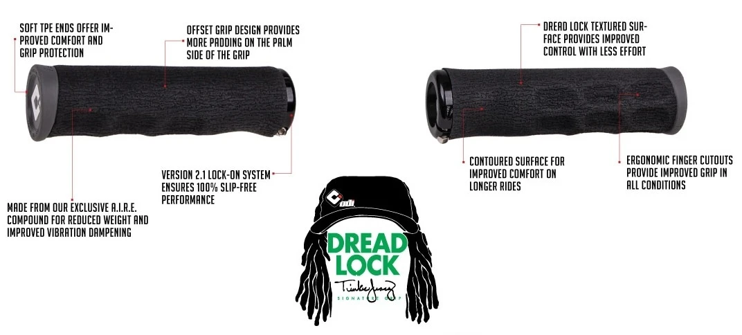 Our newest addition to the F-1 Grip Series, the Tinker Juarez Signature Dread Lock Grips offer the padding and control needed for longer rides. Designed for comfort at every turn, the Dread Lock Grips feature our exclusive ultra soft and lightweight A.I.R.E. compound along with an offset design that provides additional padding for your hands without the feel of a bulky grip. Soft TPE ends provide extra support when railing turns and help to protect your grips from impacts while the V2.1 Single-Clamp Lock-On system ensures that your grips stay put no matter what the conditions.