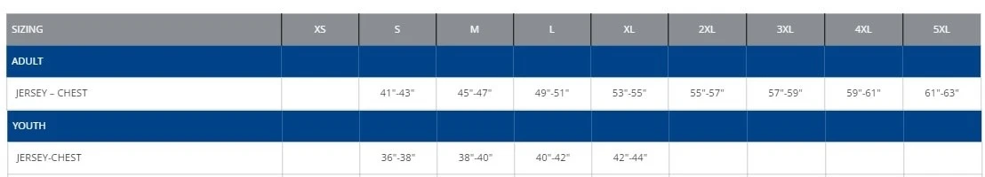 | Size | YTH SM, YTH MED, YTH LRG, YTH XL, YTH XXL, YTH GOALIE, AD SM, AD MED, AD LRG, AD XL, AD XXL, AD GOALIE, AD 4XL |