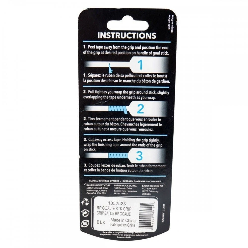 The Bauer Goal Stick Grip provides a more secure and a more comfortable grip on a goal stick’s paddle. The Goal Grip fits all goalie sticks and comes with installation instructions on the back of the packaging.