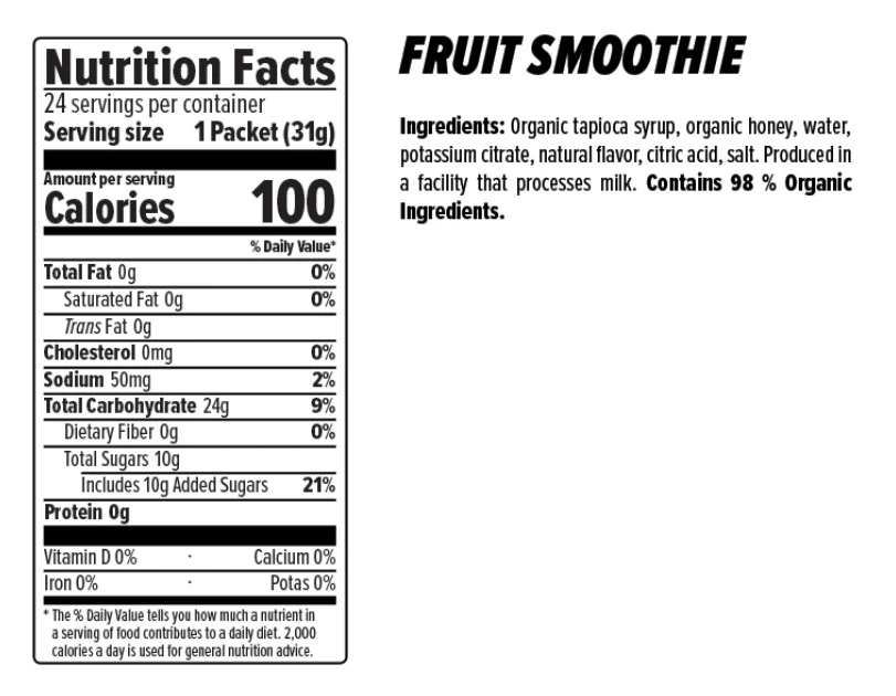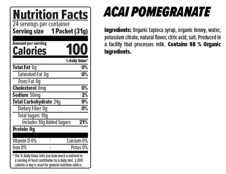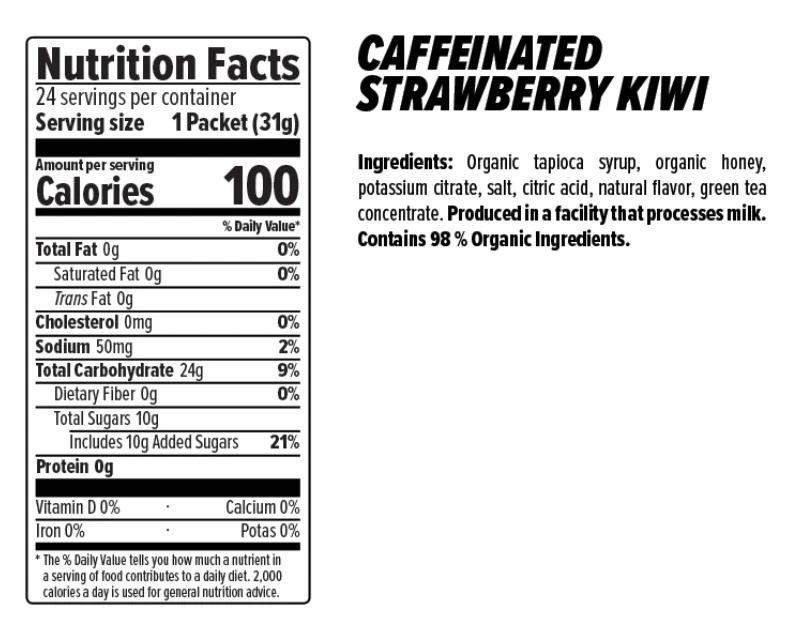Caffeinated – Utilizing our organic gel formula and naturally caffeinated with Green Tea Extract, this gel boasts hints of both sweet and tangy. Certified Gluten-Free with organic tapioca syrup, organic honey, added electrolytes and natural strawberry and kiwi flavors, this gel will keep you fueled for any athletic endeavor.